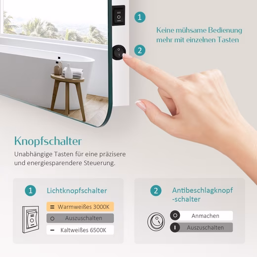 Anti-fog protection function😀 anti-fog function of the mirror is controlled by a separate button and is independent of the lighting. Compared to other mirrors, it is more energy efficient. It effectively prevents fogging up of the central surface of the mirror when showering or bathing, ensuring that you always have a clear view in the bathroom.