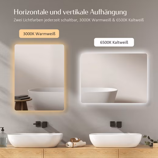 2 light colors😀 This bathroom mirror offers two selectable light colors: warm white and cool white. Whether you prefer bright, white light when applying make-up or want warm, soft lighting when relaxing in the bathroom – this LED bathroom mirror offers you the opportunity to customize the bathroom atmosphere.