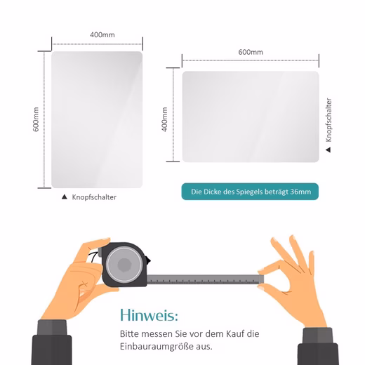Notes:Â Please confirm the size of the LED bathroom mirrors you want before placing an order to avoid order errors. (Please measure your installation space before buying a bathroom mirror)