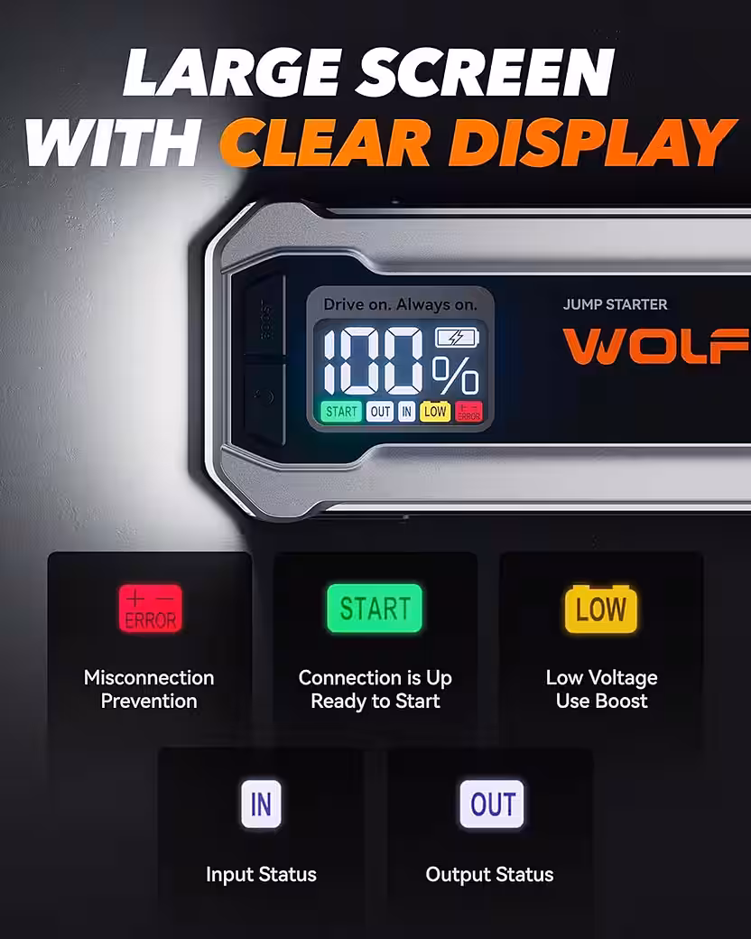 - This LED display clearly shows all status indicators of the portable car jump starter.