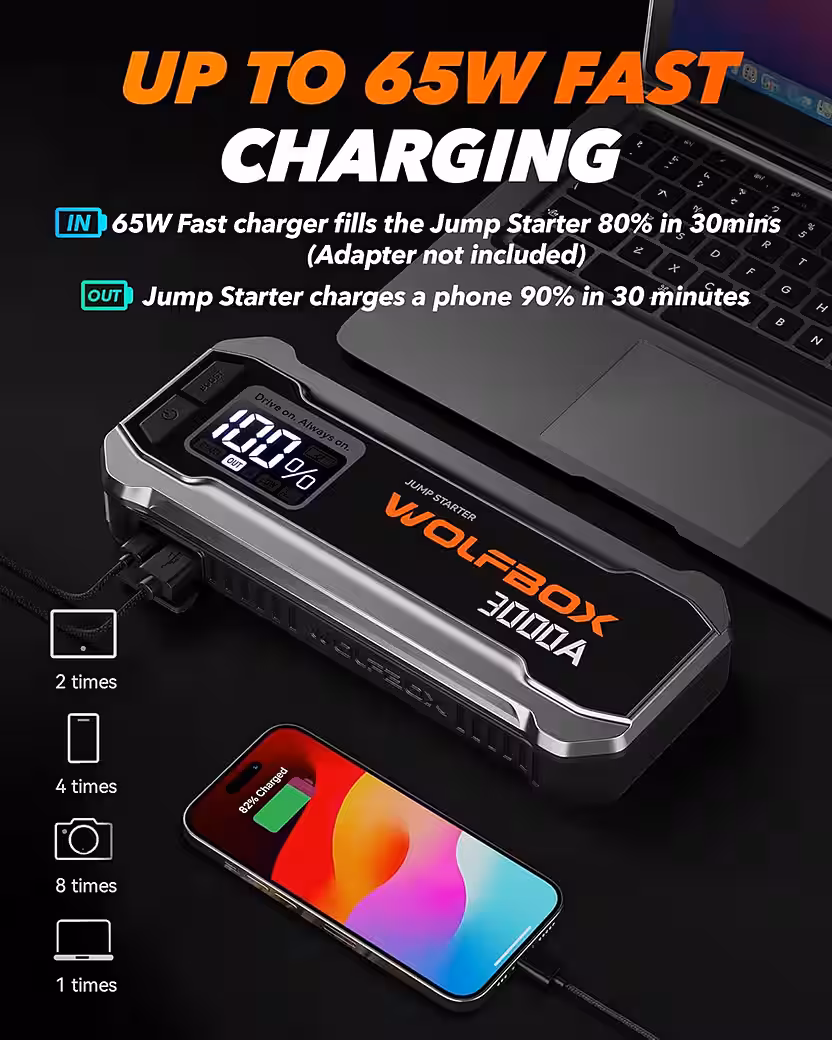 - Equipped with a 65W Type-C input/output port and a QC3.0 USB-A port, this jump starter kit can be fully charged in just one hour.