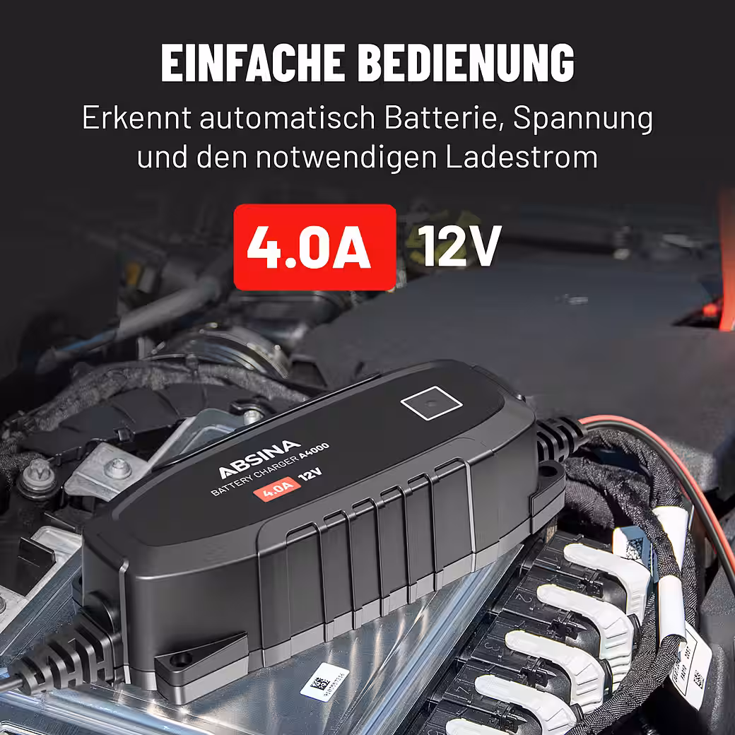 • DELIVERY includes 1x 12V car battery charger A4000 with terminal clamps / 3.6m cable / 4000mA charging current / operating voltage 220-240V / 182x72x47mm / 470g / standby power <1W
