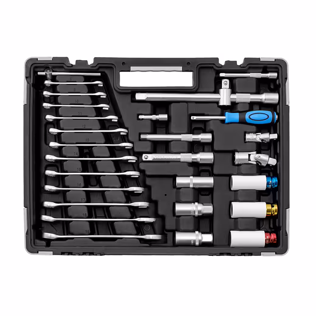 - Other equipment highlights include a 12-piece set of combination wrenches and 3 automotive socket wrenches with protective inserts for alloy wheels.