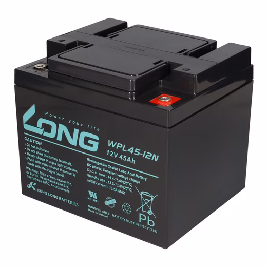 For IT/telecommunications and UPS systems that require a reliable power supply, the Kung Long battery 12V 45Ah Pb Longlife is the perfect choice. With a lifespan of 10 to 12 years and a nominal capacity of 45 Ah and a nominal voltage of 12 volts, this lead-acid battery from the AGM WPL series is durable enough to meet the requirements of IT/telecommunications and UPS systems. With an M6 (6 mm) screw connection and dimensions of 199 x 166 x 171 mm, installation and use is easy.