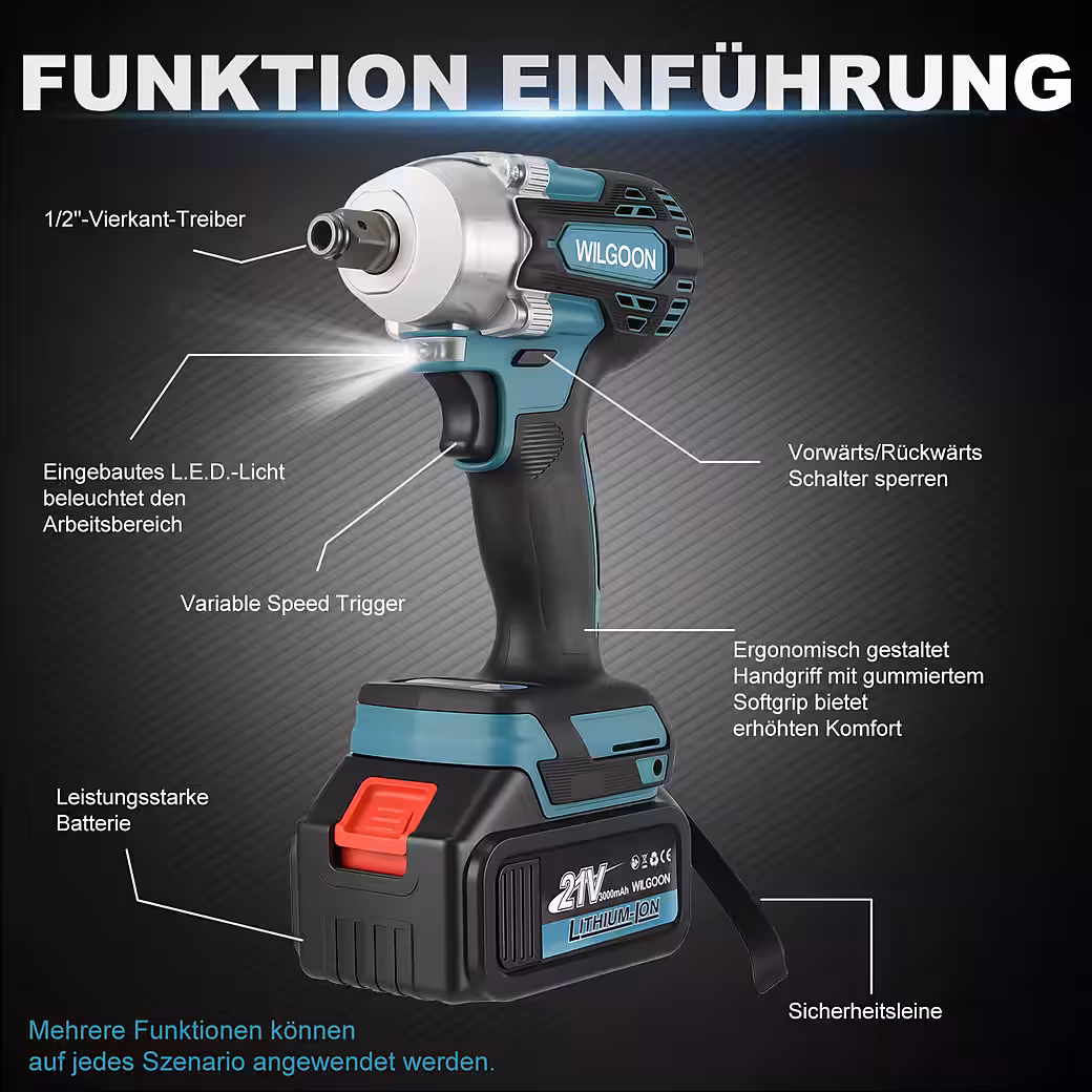 – Maximum 21V impact wrench powered by a high-performance motor and a rechargeable 3000mAh battery. Features a durable aluminum head, excellent sealing, and a tungsten steel rotating shaft.