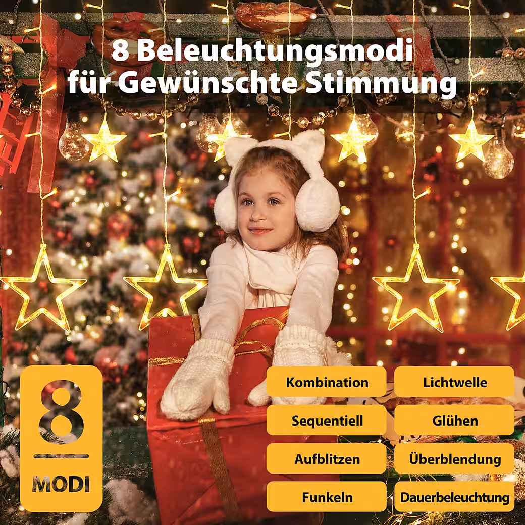 • Parameters: 2m long and 1m wide LED light chain with 12 strands, each with a star, a total of 138 LEDs.