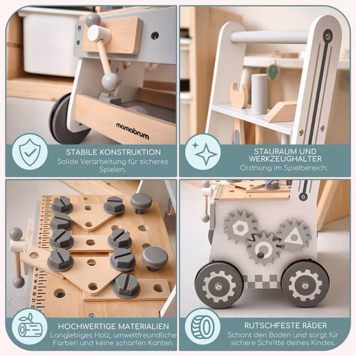 This walking aid combines learning with fun and is made of sturdy wood. It is free of dangerous sharp parts and supports your child during their first steps. The stable, non-slip wooden wheels with rubber tires prevent scratches on the floor and ensure safe movement.