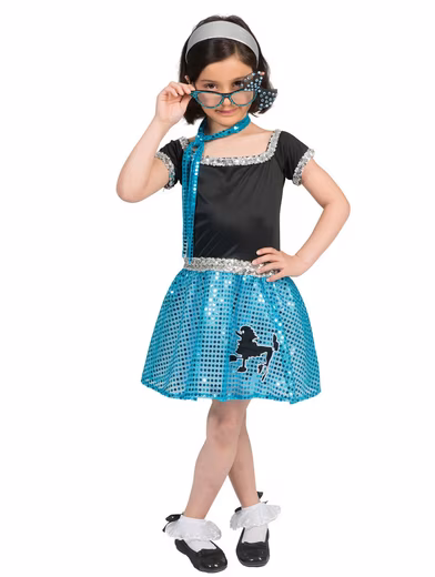 - The girl’s costume is rounded off by the printed black poodle, which gives the outfit the typical 50s charm