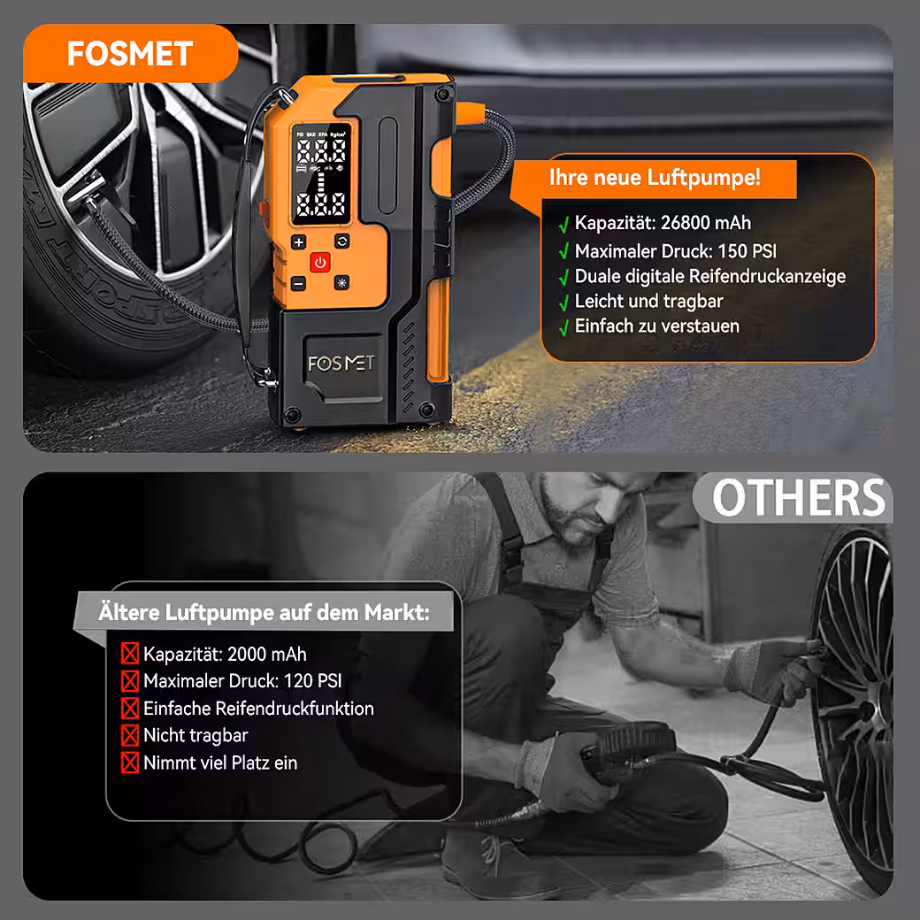 This jump starter features a built-in 26800 mAh battery. This jump starter power bank with an integrated  150 PSI  air compressor is a powerful, multifunctional, and safe device – ideal for everyday use, road trips, and emergencies.