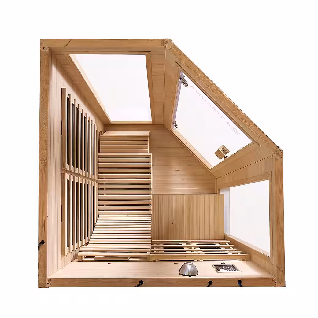 - Infrared sauna made of hemlock wood: excellent heat insulation and resistant to moisture; pleasant cabin climate.
