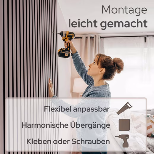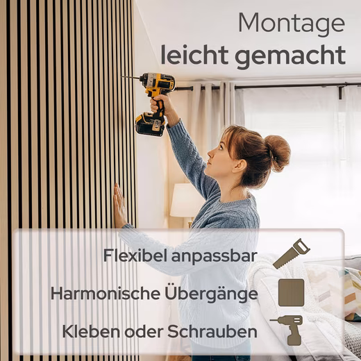 Whether on walls or ceilings – installation is effortless. Thanks to the sturdy MDF base and flexible backing, the panels can be individually cut to size and fastened with screws, nails or assembly adhesive. Ideal for creative DIY projects and modern interiors.