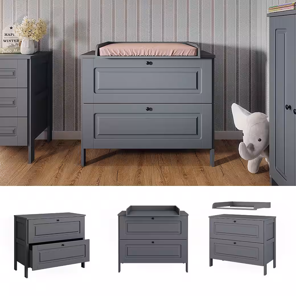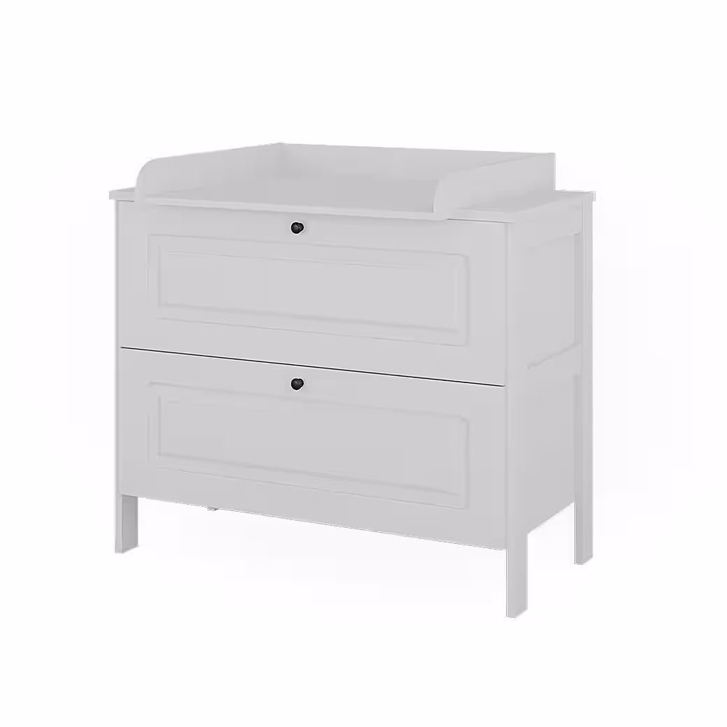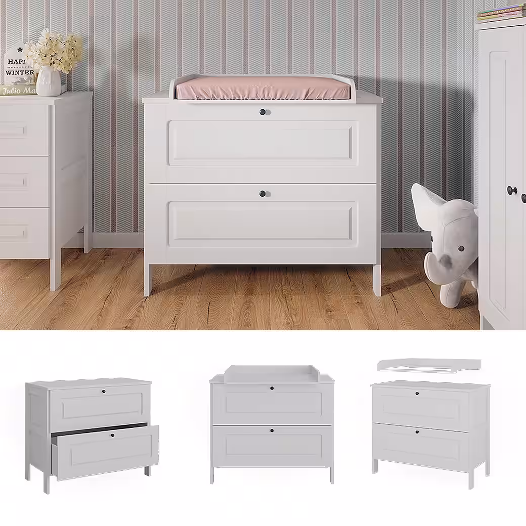 - The chest of drawers has two drawers and offers a practical way to make the baby’s wrapping quickly and comfortably.