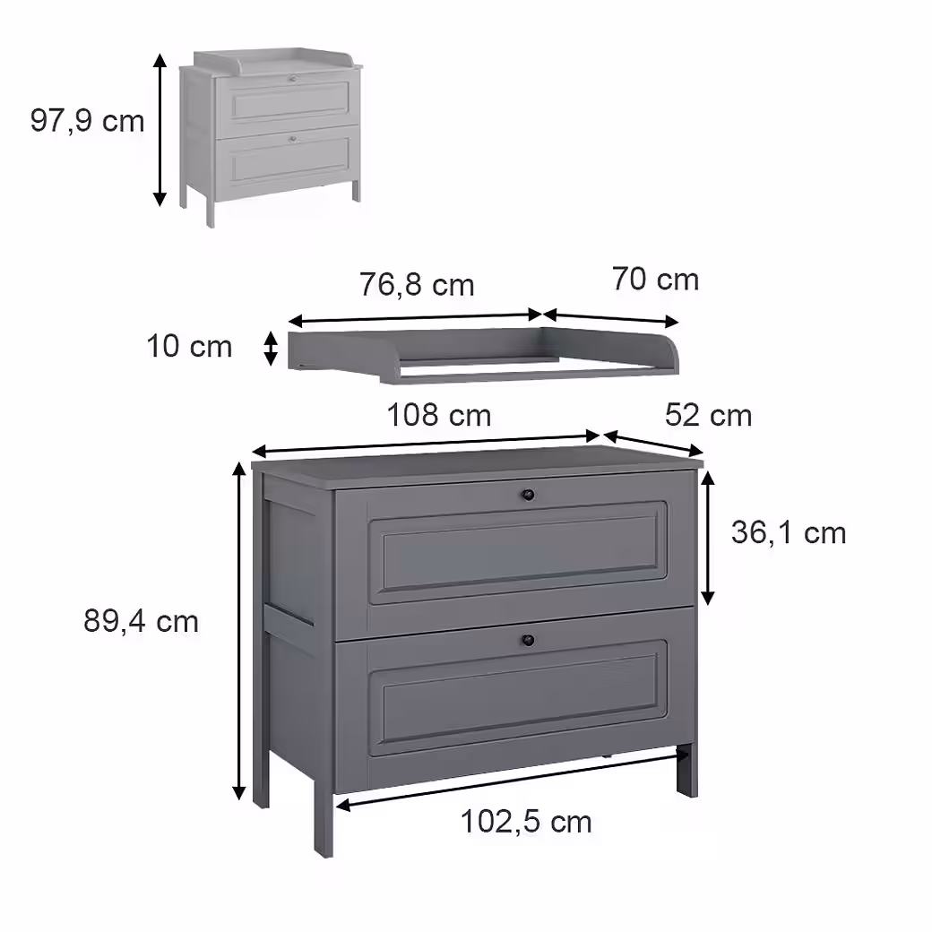 - CUSTOMARY: The baby changing table has a depth of 70 cm, a width of 108 cm and a height of 97.9 cm.