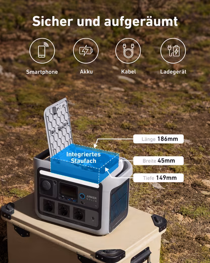Q: What things fit in the built-in storage compartment of the Anker SOLIX C800 portable power station?