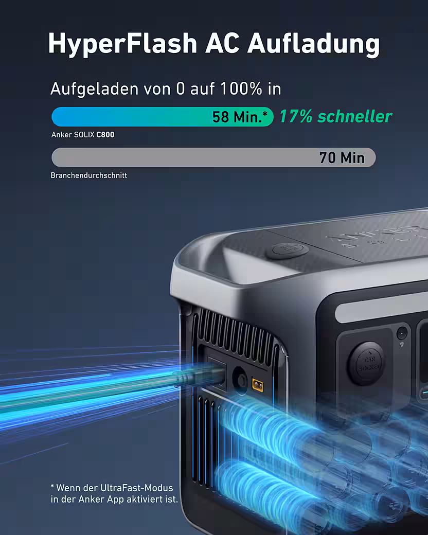 BLAZING-FAST CHARGING: When you need a quick charge, simply activate UltraFast Charging in the Anker app. The Anker SOLIX C800 then charges in just 58 minutes, 17% faster than usual.
