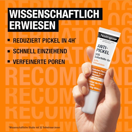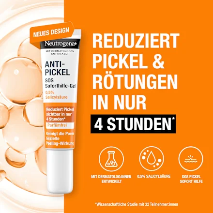 The oil-free, fast-absorbing Neutrogena Anti-Blemish SOS Instant Relief Gel reduces the size of pimples and redness in just 4 hours. It starts working immediately without drying out the skin. Simply apply directly to the pimple every morning and evening. Avoid contact with the eyes and do not use on irritated skin. Discontinue use if skin irritation occurs. The gel provides immediate relief from pimples and blemishes – for visibly relaxed and healthy-looking skin. A small drop per pimple is sufficient – ​​making the gel particularly economical.