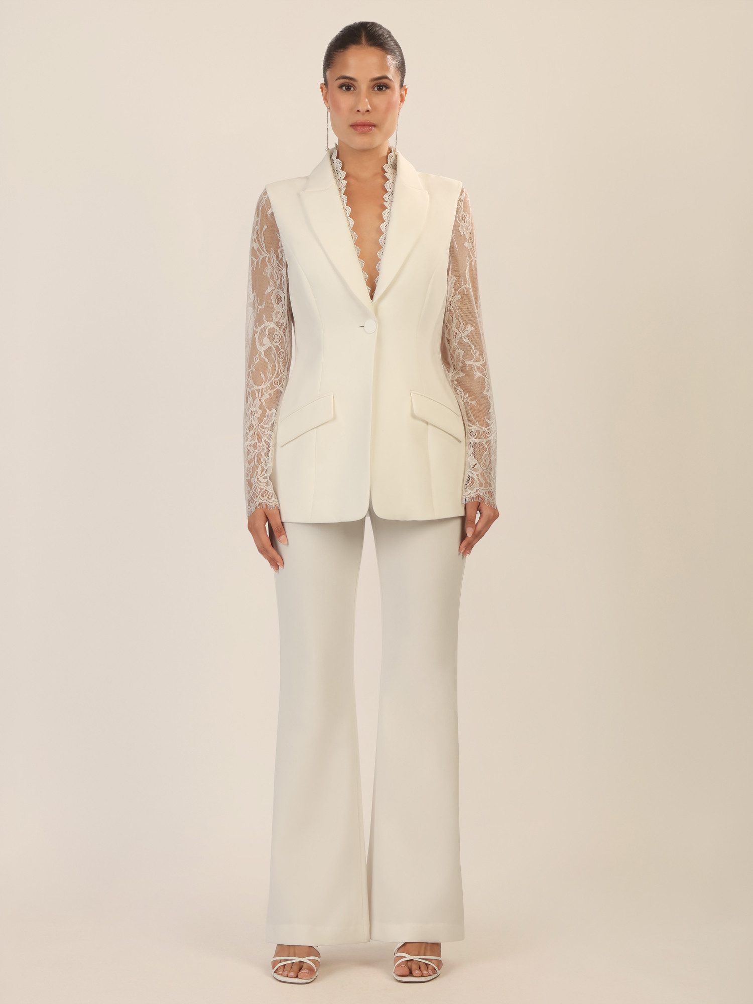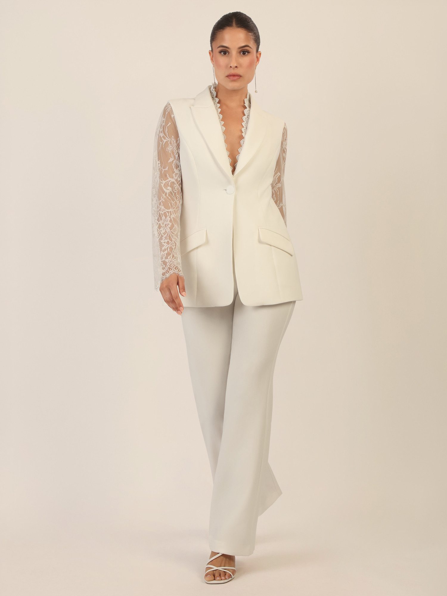 A pantsuit that combines classic tailoring with romantic details. The figure-hugging blazer features deep, peaked lapels and a detachable lace trim along the neckline—a sophisticated yet versatile highlight. Refined dividing seams precisely shape the top and emphasize its feminine lines. Slanted flap pockets at hip height add practical accents, while a back slit ensures freedom of movement. The long sleeves made of transparent, soft lace end in a delicate scalloped edge—a stylish contrast to the structured, fully lined body. The matching trousers boast an elegant bootcut silhouette and finely coordinated details: a shaped waistband with lace appliqués meets classic belt loops and a concealed hook closure. Slanted pockets complete the design for everyday wear. This two-piece suit is a modern classic—sophisticated, feminine, and with great attention to detail. Blazer length approx. 68 cm, side length of the trousers approx. 108 cm.