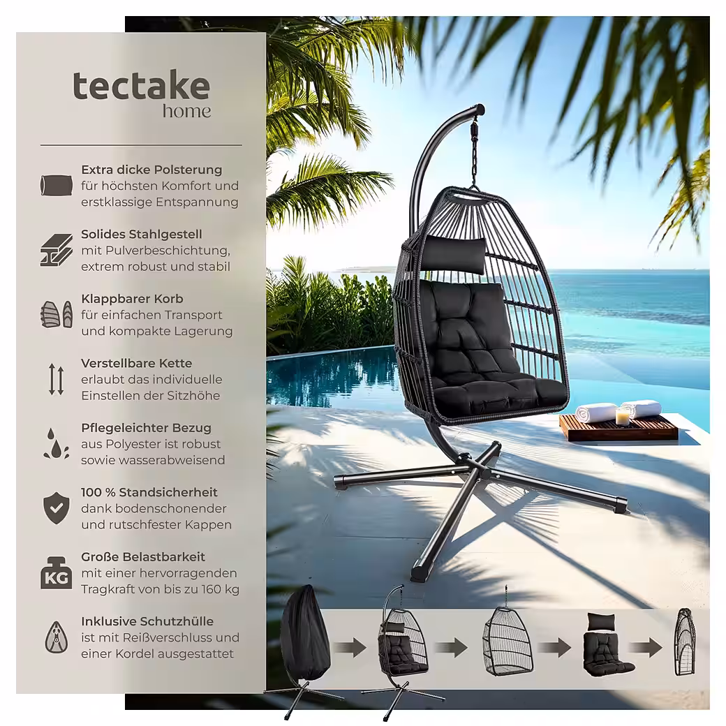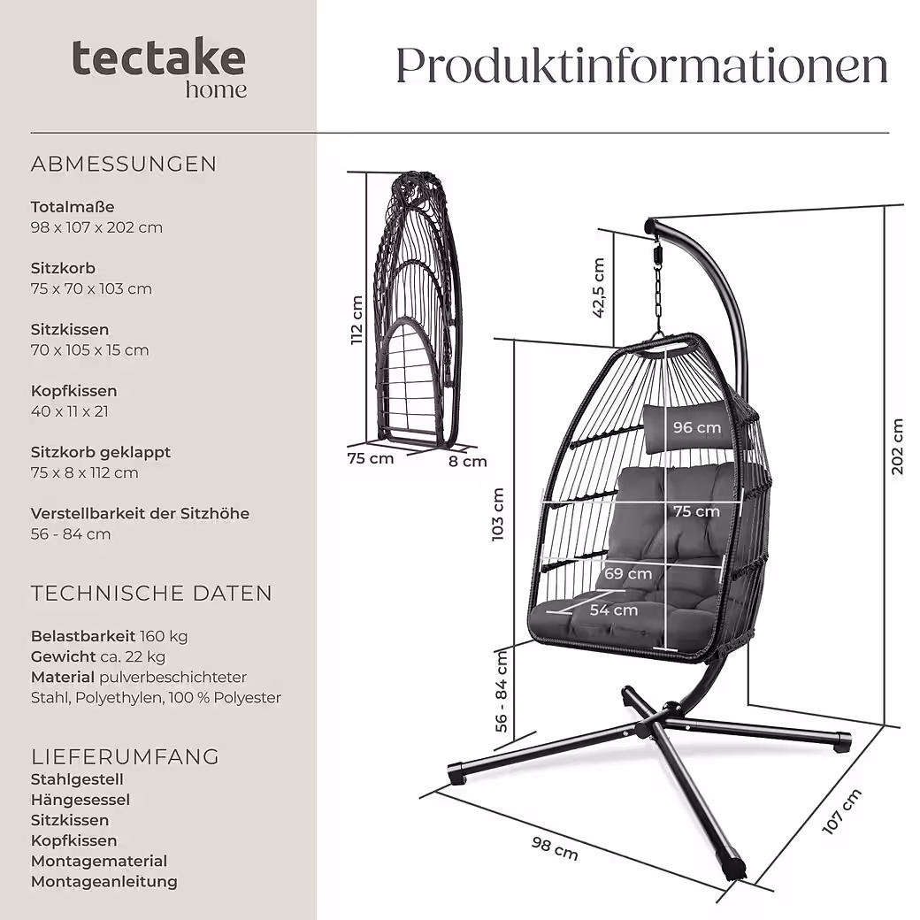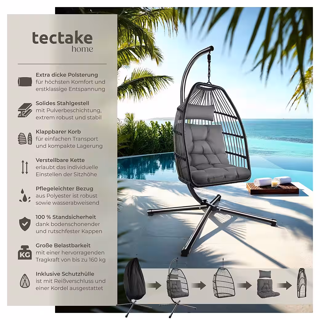 Discover the Tectake Ariane hanging chair – the perfect retreat for relaxing hours in the garden or at home. This luxurious hanging chair combines style and comfort, setting new standards in relaxation and well-being. The Ariane hanging chair impresses with its modern design and high-quality workmanship. It is made of a robust steel frame that ensures maximum stability and a weight capacity of up to 160 kg. So you can lean back safely and let your mind wander. With its extra-thick seat and head cushions, the Ariane hanging chair offers unparalleled seating comfort. The soft padding adapts perfectly to your body and ensures a relaxed posture – ideal for long evenings of reading or cozy conversations with friends. Another highlight of the Ariane hanging chair is its versatility. Whether in the living room, on the patio, or in the garden – this hanging chair looks great anywhere. Thanks to the included protective cover, it is well protected against wind and weather, so you can use it outdoors without any problems. The Ariane hanging chair is not only comfortable but also practical. It folds up easily and can be stored away to save space when not in use. It’s also gentle on floors and won’t leave scratches or marks on delicate surfaces. Cleaning the hanging chair is a breeze. The easy-care material of the seat and cover can be wiped clean quickly and easily, so your hanging chair always looks like new.Technical details