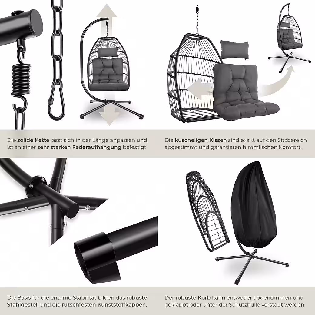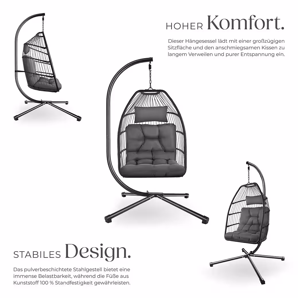 | Scope of delivery | 1x steel frame, 1x hanging chair, 1x seat cushion, 1x headrest, 1x mounting hardware |