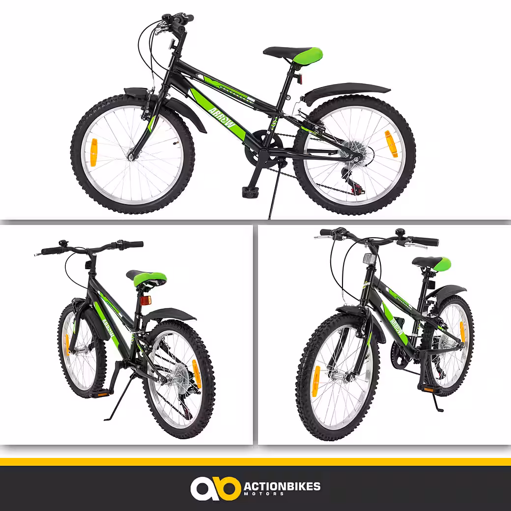 What’s that zooming around the corner? It’s the Arrow 20-inch children’s bicycle! The classic black design is accentuated by vibrant green details, making it a real eye-catcher.