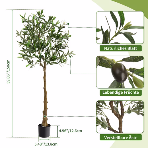 • Realistic design with natural wood trunk: The artificial olive tree impresses with a lifelike trunk made of natural wood and lifelike leaves and olive fruits.