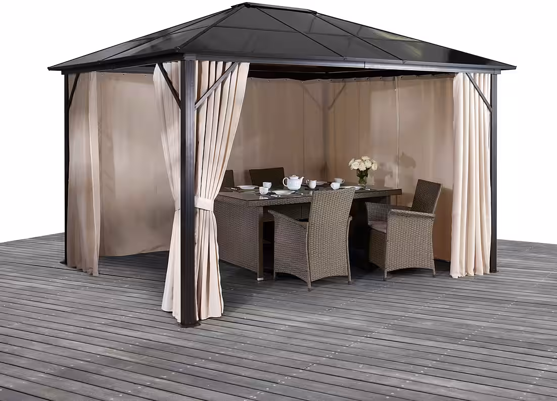 Miles of white beaches and a tropical maritime climate – Western Europeans can only dream of the weather on the Caribbean island of Aruba. So why not bring a touch of tropical flair to your own garden with the pavilion of the same name? Featuring a dark roof made of polycarbonate twin-wall sheets and equally dark posts, the pavilion, with its beautifully contrasting beige side panels, is a real eye-catcher and guaranteed to create a feel-good atmosphere. And if the summer here turns out to be a little less tropical, the pavilion is also remarkably stable, just in case.