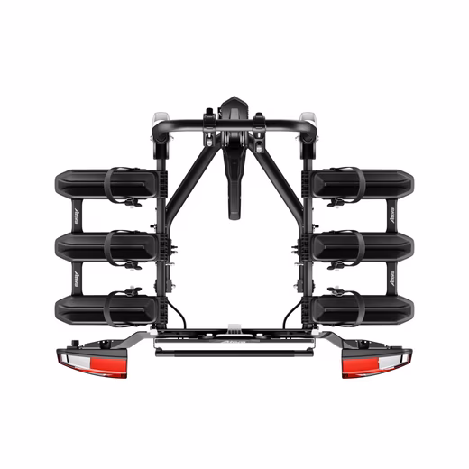 The Atera Forza L is the perfect choice for anyone who wants to transport up to 3 bicycles safely and conveniently. With a maximum load capacity of 65 kg, this towbar-mounted bike rack is ideal for e-bikes, mountain bikes, or road bikes. Thanks to its foldable design, the rack can be stored in a space-saving manner, while the practical quick-release fastener allows for effortless mounting on the towbar. Technical specifications: • Weight: 21 kg • Max. load capacity: 65 kg • Max. load capacity per wheel rail: 30 kg • Dimensions (W/H/D): 1200 / 710 / 945 mm • Folded dimensions (W/H/D): 565 / 225 / 945 mm • Wheel rail spacing: 210 mm • Bicycle tire width: up to 4.0 inches • Bicycle frame diameter: 25-80 mm • Max. wheelbase: 1300 mm
