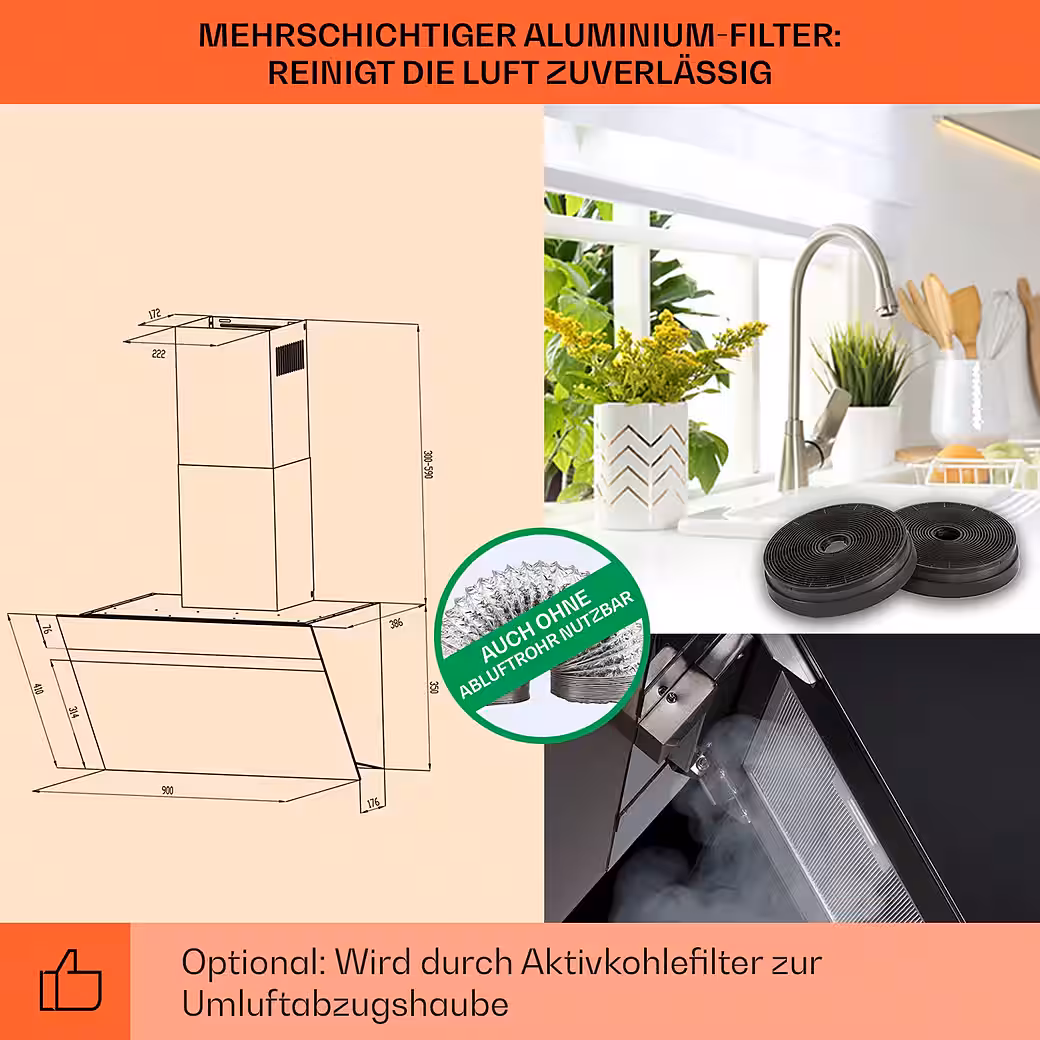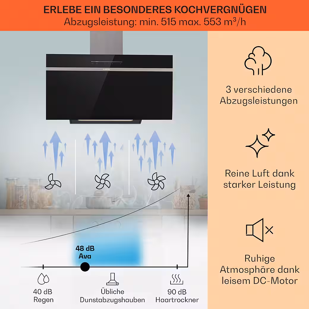 With a width of 90 cm, the Klarstein Ava extractor hood is ideally suited for medium to large cooktops and kitchen units. Technically, it impresses not only with an extraction rate of up to 515 cubic meters per hour, but also with its exceptionally user-friendly operation. Control is straightforward, either via Wi-Fi using the Klarstein app or directly via the Red Line touch control panel on the front. Here you can select from three fan speeds, a high-performance booster function, and a timer for after-ventilation. You can also adjust the brightness and color temperature of the integrated LED cooktop lighting.
