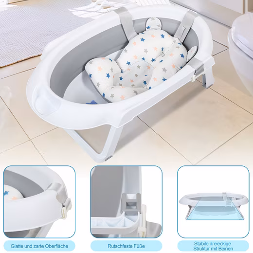 Flexible and adaptable: the included stand allows the tub to be used with a weight of up to 10 kg, which is particularly suitable for newborns up to 3 months. For children aged 4 months to 5 years, we recommend using the tub without a stand by simply placing it on the floor. In addition, the enclosed bathing aid is suitable for children from 0-2 years.