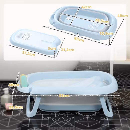 Foldable size: 83L x 48W x 10.5H cm (bathtub), 57.2L x 31.2W x 5H cm (bath support)