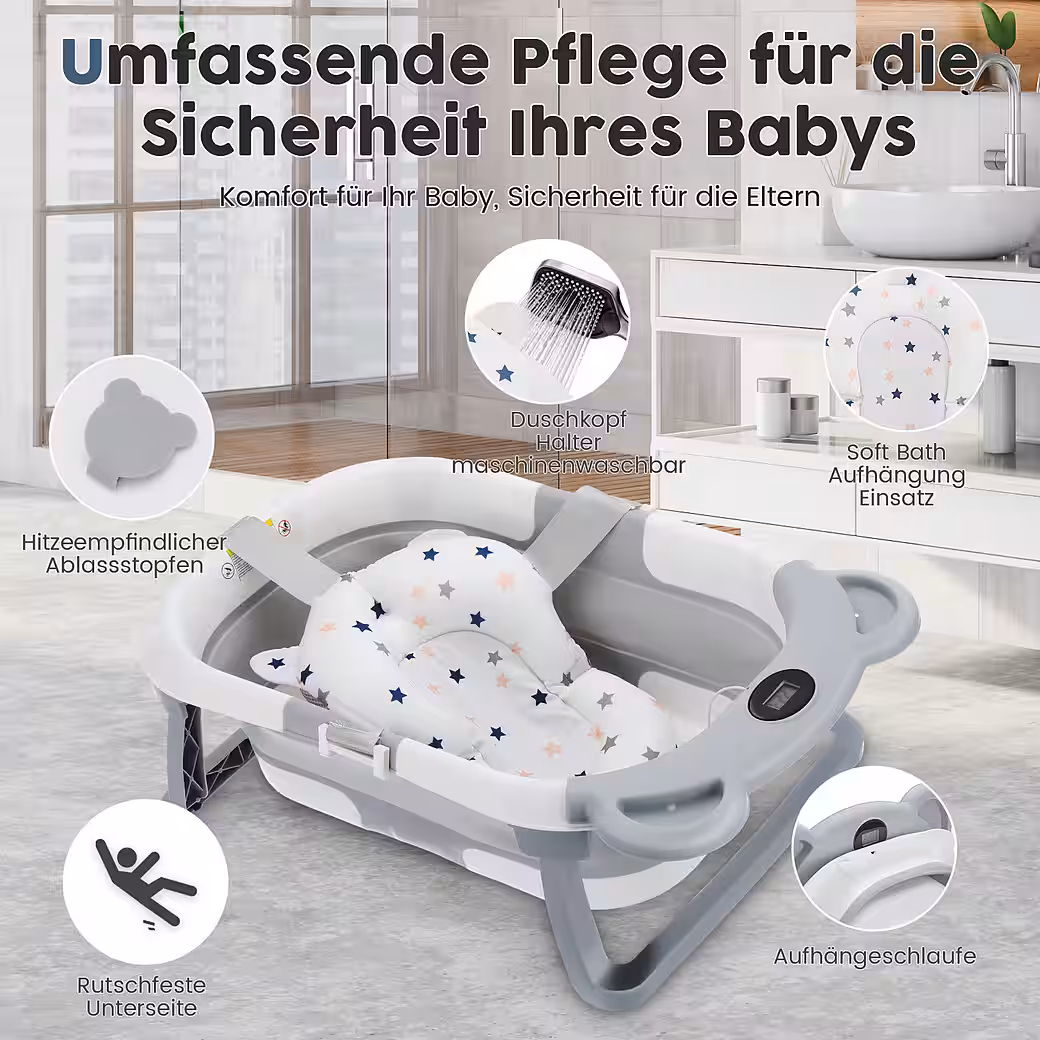 Intelligent designUnlike ordinary baby bathtubs, our baby bathtub features a real-time temperature sensor to ensure your baby’s comfort and well-being. The all-around temperature-locking system minimizes heat loss. The drain, located above the bottom and equipped with an easy-to-pull rubber stopper, makes draining the water simple without having to move the tub.