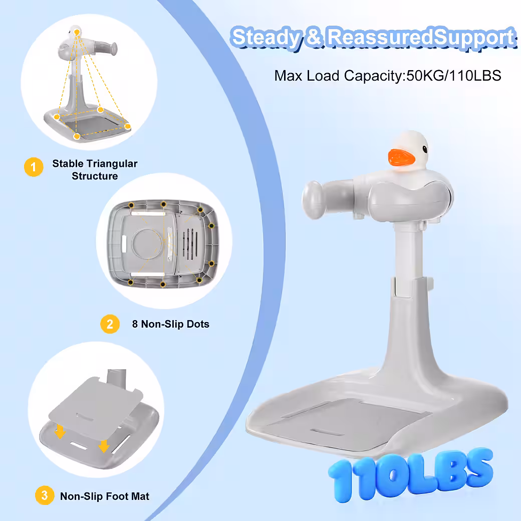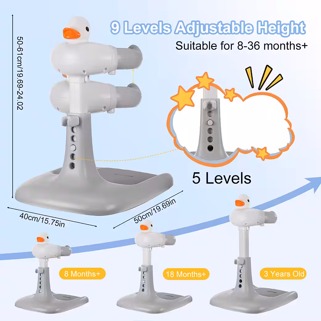ERGONOMIC & ADJUSTABLE DESIGN: This baby shower stand is made of ABS plastic and features an ergonomically adjustable backrest that conforms to the natural curve of your baby’s back. It offers 5 height settings suitable for babies from 8 to 36 months old. This baby shower stand perfectly adapts to the evolutionary needs of each developmental stage, promoting healthy posture and supporting your baby’s growth.