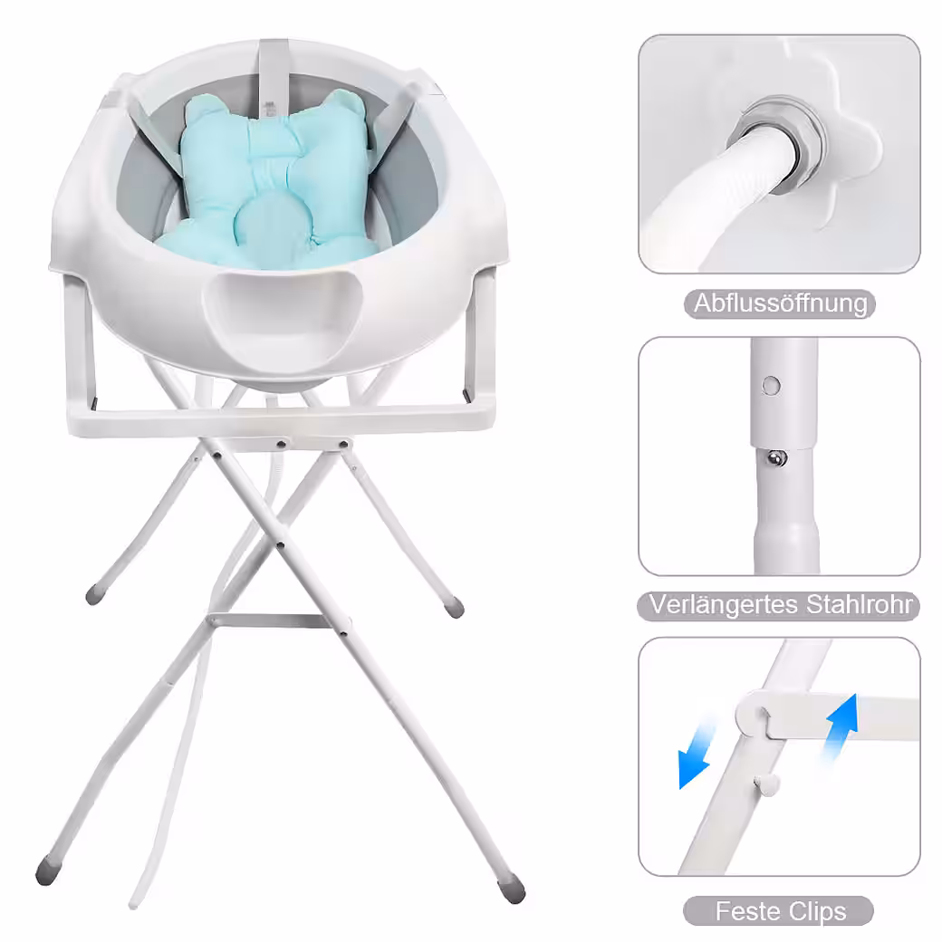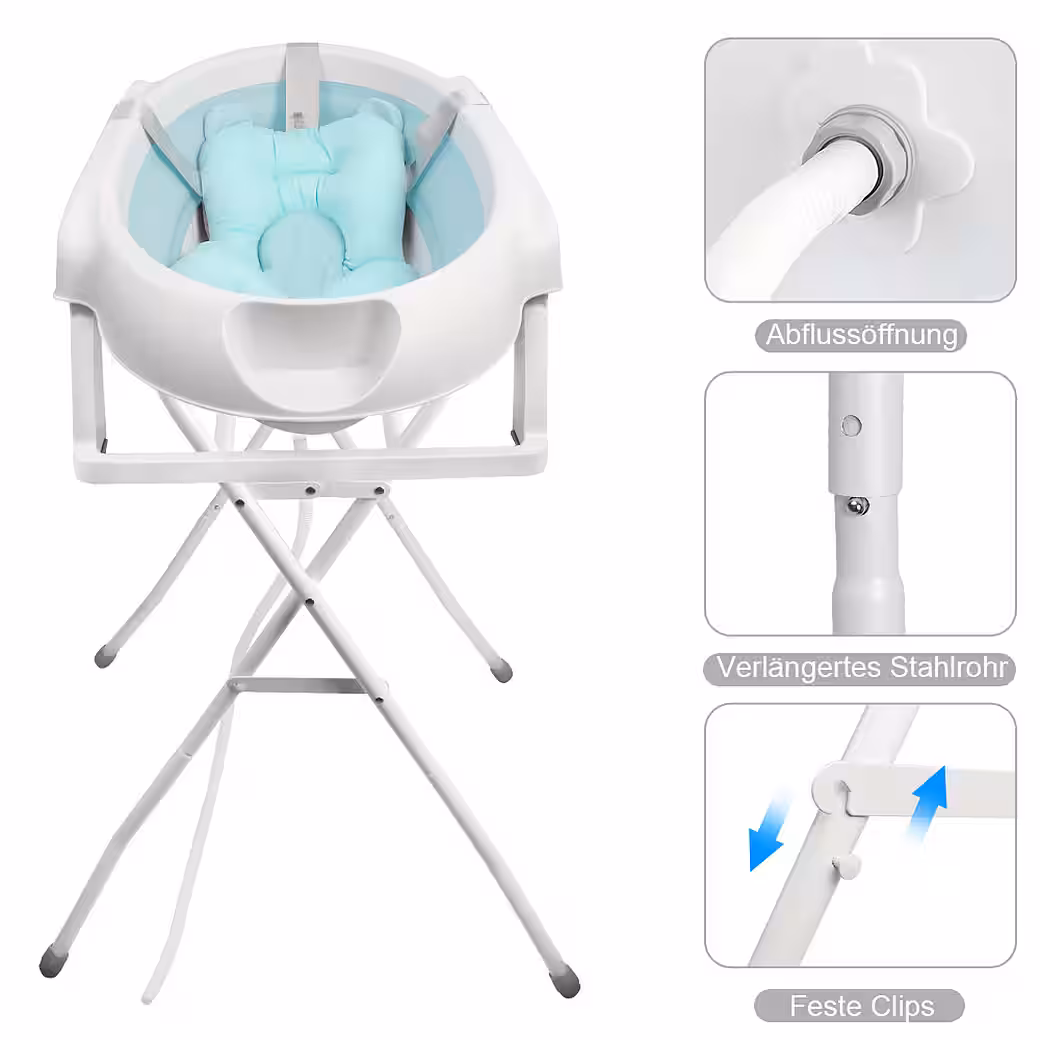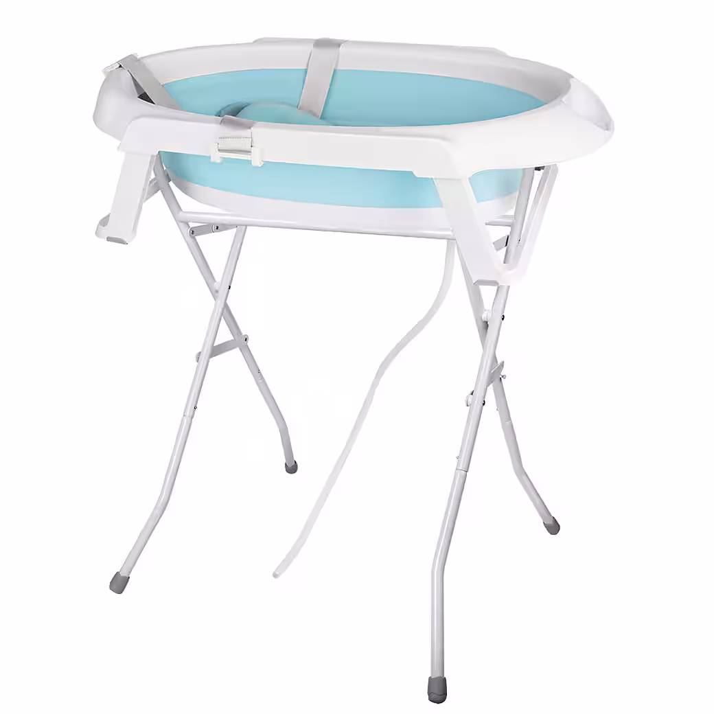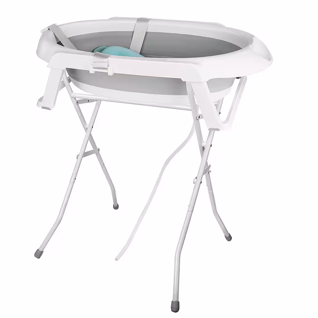 Baby Bathtub with Stand — MAKES BABIES BATHING EASIER Thanks to the baby bathtub with stand, you always have your baby at a comfortable height. The sturdy baby bathtub stand is made of metal and easily supports the weight of the bathtub and your child. After bathing, you can simply fold the stand up and store it away.