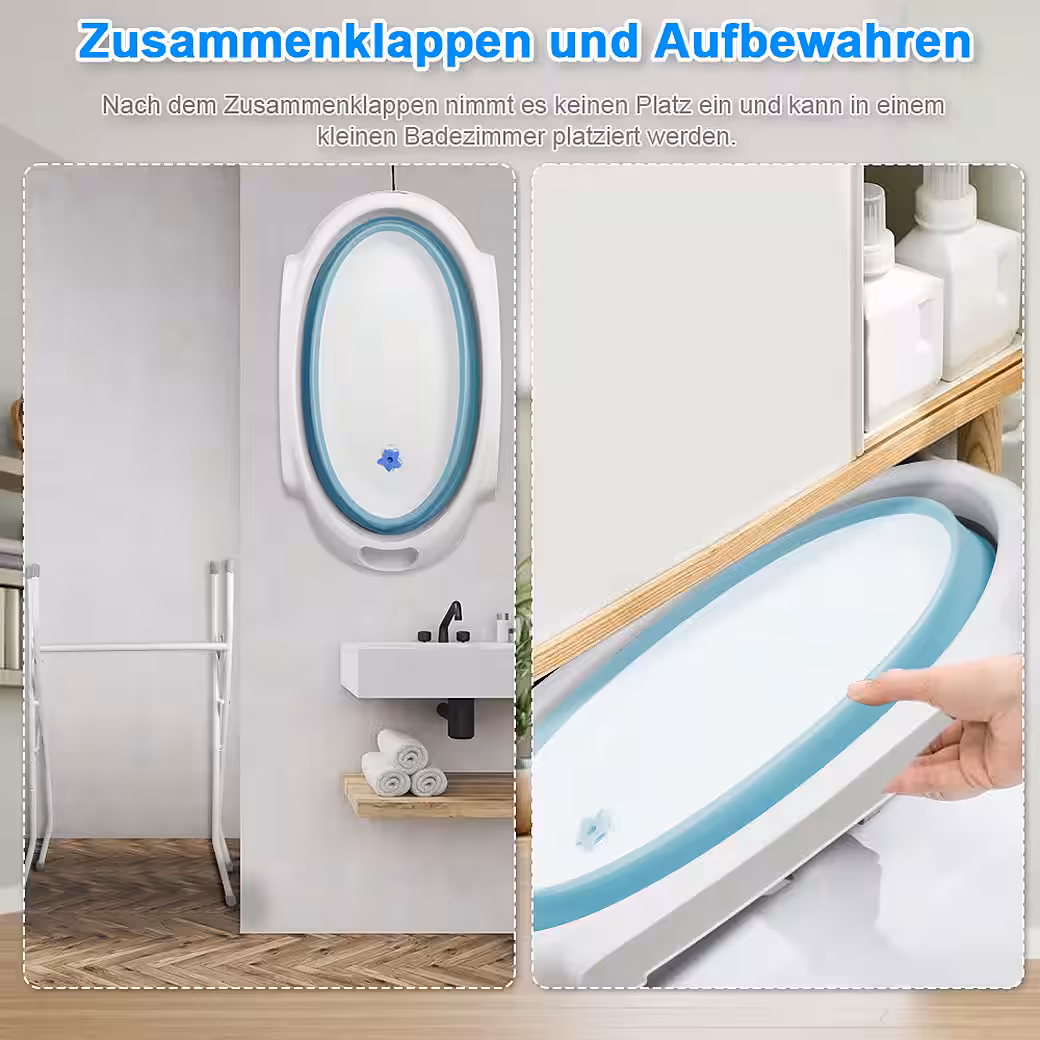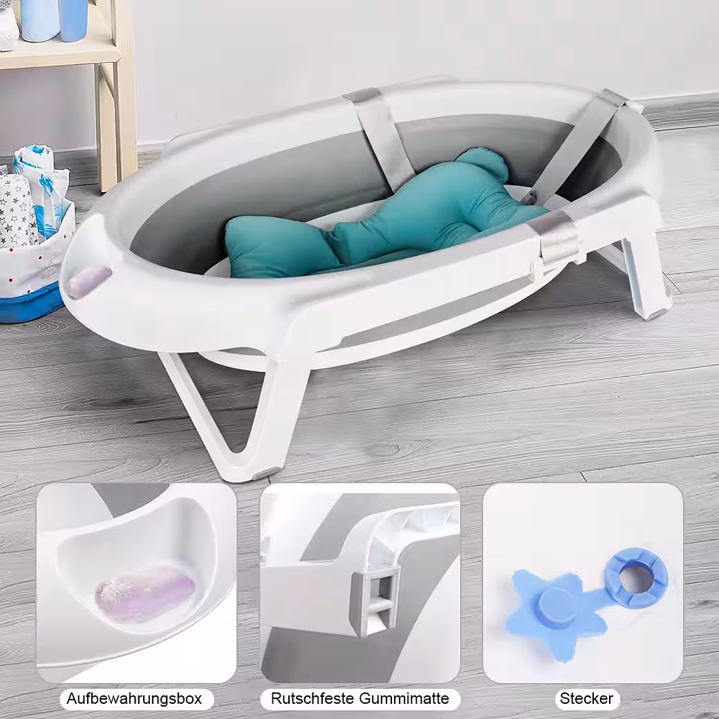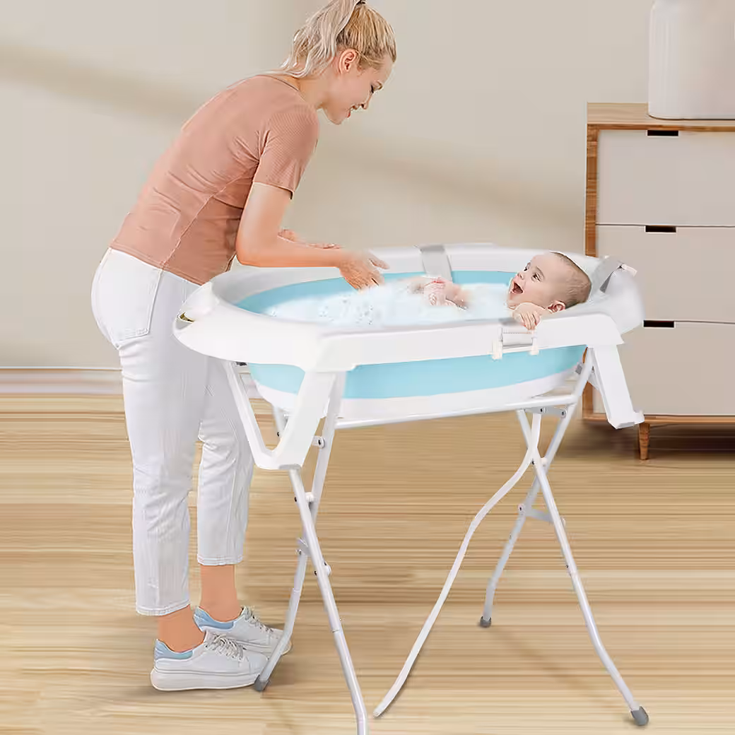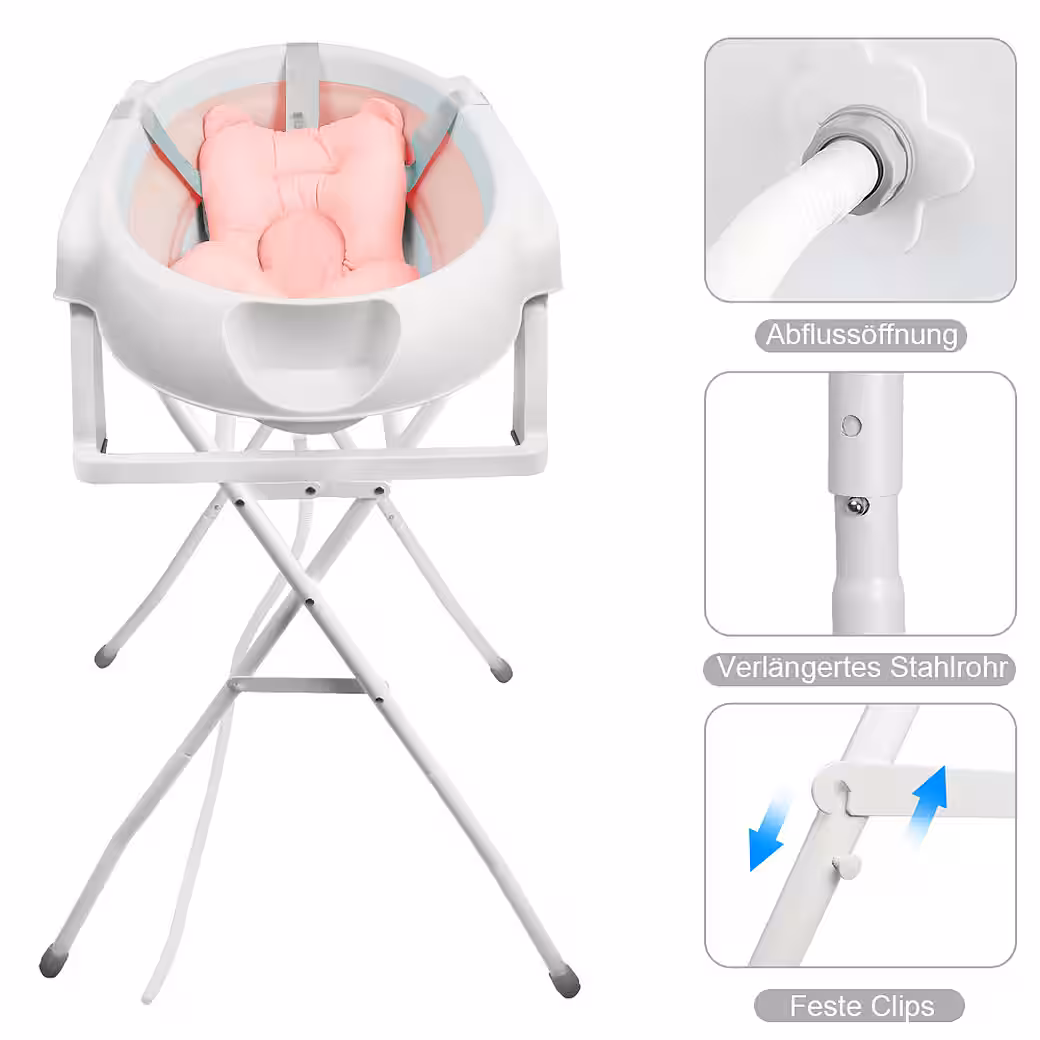 Baby Bathtub with Stand — MAKES BABIES BATHING EASIER Thanks to the baby bathtub with stand, you always have your baby at a comfortable height. The sturdy baby bathtub stand is made of metal and easily supports the weight of the bathtub and your child. After bathing, you can simply fold the stand up and store it away.