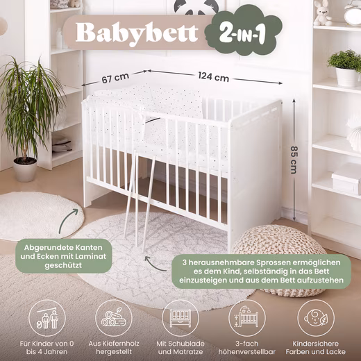 With just a few simple steps, the side rail can be removed and the bed transformed into a toddler bed for slightly older children aged 3 to 4. The bed features a sturdy frame and a 3-position height-adjustable slatted base made of pine wood. The set includes a polyurethane foam and coconut fiber mattress with a washable cover.