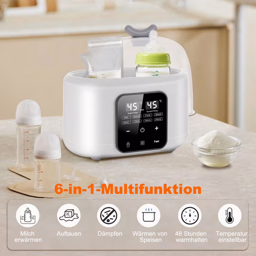 - Double bottles: The adjustable lid fits all bottles. The bottle warmer thaws breast milk and sterilizes teats, bottles, forks, and spoons.