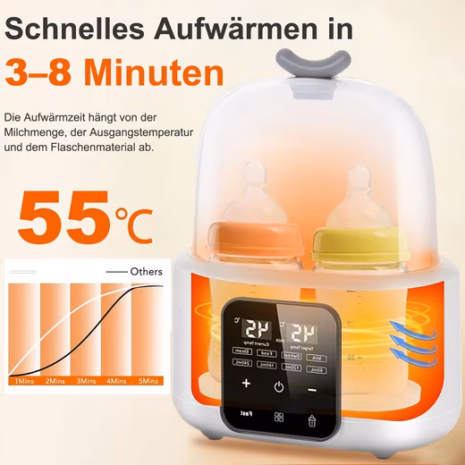 - Fast warming: Warms the milk in just 3-8 minutes, ensuring a quick feeding to soothe your baby and prevent crying.