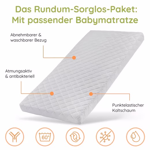 The set includes a high-quality cold foam mattress (6 cm) that, thanks to its point elasticity and breathability, ensures a healthy and restful sleep for your baby. The mattress cover is removable and washable – for extra hygiene in everyday use.