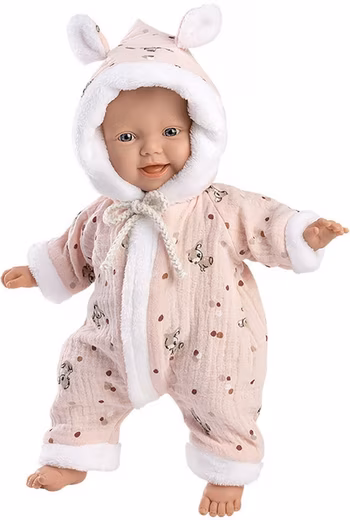 This adorable baby doll is 32 cm tall with blue eyes and a soft body. Her head, arms, and legs are made of delicate vinyl. This soft-bodied doll is handmade in Spain. Quality and product safety are paramount for the Llorens family of dollmakers. The soft-bodied dolls are meticulously crafted down to the smallest detail. Their expressive faces give each doll its own unique personality. The love and care put into the doll’s creation are also evident in its clothing and accessories, which are made from real wool and fine fabrics. The doll comes with a cuddly pink onesie with cute little ears, presented in a high-quality gift box, making it the perfect present for various occasions such as Christmas, Easter, or birthdays.