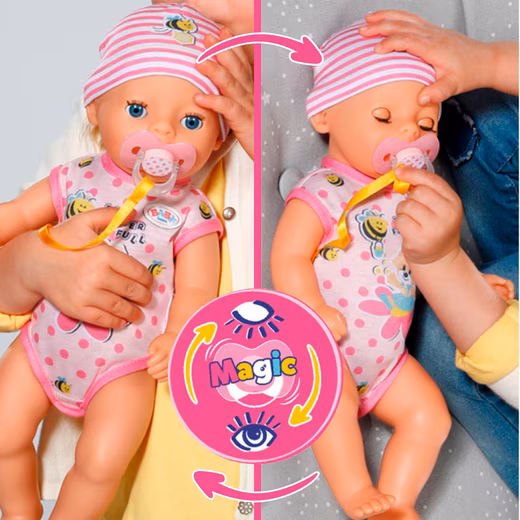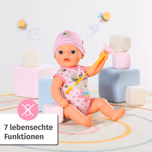 BABY born Little Baby Girl, Lena, has 7 great features, all of which work without batteries. She comes with everything she needs. She can drink water from her bottle, wet her cloth diaper, or use her pink potty. When she gets her pacifier, which is attached to her bodysuit, she magically opens or closes her eyes, whether she’s sitting or lying down. Her arms, legs, and head are super flexible, making dressing and undressing a breeze. At 36 cm, she’s suitable for smaller children’s hands from one year old and is the perfect doll to introduce them to the world of baby play. Then you can even sit on the potty together and playfully support your child during potty training.