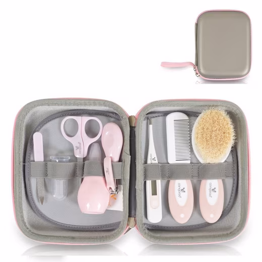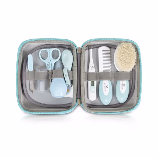 The useful and practical baby care set M1419 from Cangaroo contains everything you need. It includes nail scissors and nail clippers with rounded edges for maximum safety when cutting baby’s nails. The nail file gently smoothes the rough spots along the edges of baby nails. In addition, a finger toothbrush, nasal aspirator, comb, brush and a digital thermometer. The baby nail set with storage case allows you to place any part in it quickly and precisely. The practical size also allows you to take it with you when traveling.