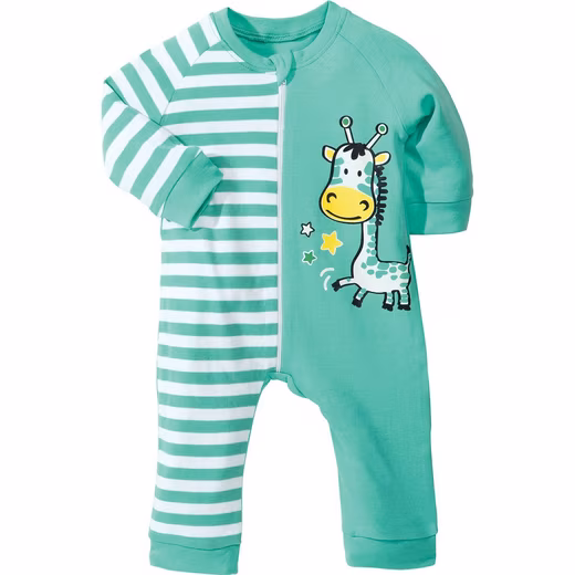 Erwin Müller Interlock Jersey Baby Pajamas, 2-Pack. Your tired little one will love snuggling up in these cuddly soft onesies. Whether printed all over with stars or featuring playful knitted stripes with a fun giraffe motif, the pretty design and comfortable fit are sure to delight. Easy to put on thanks to the long zipper. The skin-friendly, naturally stretchy fabric ensures exceptional comfort.