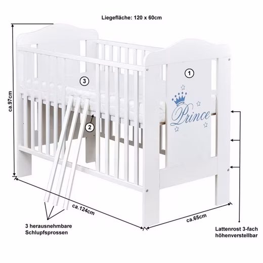 Thanks to the 3-way height-adjustable slatted base (20 cm, 36 cm and 49 cm), it grows with your baby, while the three removable slip bars allow your child to get in and out independently later on.