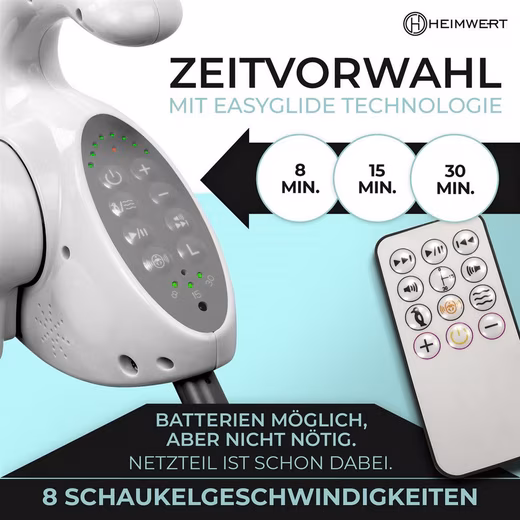 You can use the motion detection to specify that the rocking motion resumes for calming down. 8, 15 and 30 minutes of rocking time are preset.