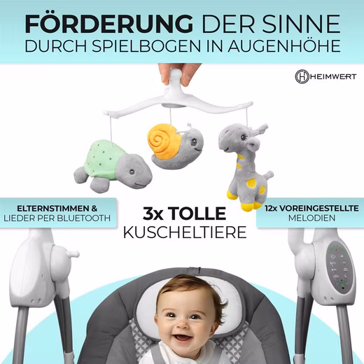 Heimwert baby bouncer electric with 5-point harness and Easyglide, up to 9 kg weight, 1x play arch with 3 cuddly toys, 1x remote control, 1x multilingual operating instructions, 1x power supply approx. 2 m long |