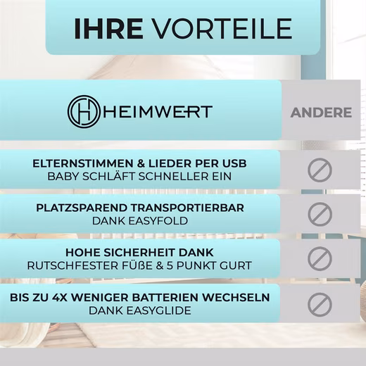 This is now finally possible with the Heimwert Baby Swing in contrast to a conventional baby swing. Simply play your favourite songs via Bluetooth on the rocker’s speaker. Via the remote control and optionally via the control panel of the baby bouncer, even self-sung songs can be played again. 12 preset melodies and soundscapes are also available. Your sweetheart will calm down much faster.