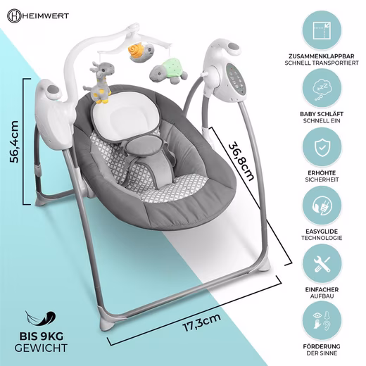 Heimwert electric baby bouncer with 5-point harness and Easyglide, up to 9 kg weight, 1x play arch with 3 cuddly toys, 1x remote control, 1x multilingual instruction manual, 1x power adapter approx. 2 m long |