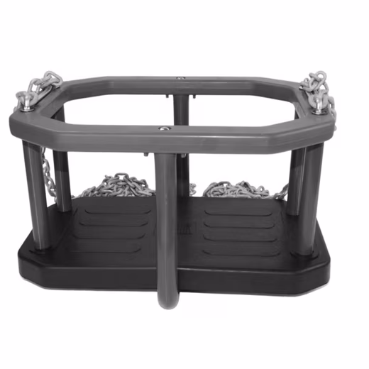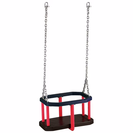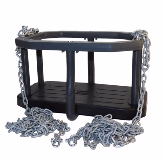 Baby swing seat with rubber surfaces and aluminium insert, galvanised chain set and shackles.