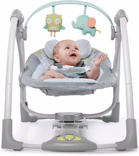 The Swing ‘n Go Portable Swingâ„¢ offers plush luxury and is easy to transport! With neutral pastel colors and ultra-plush padding and materials, this baby swing is the perfect, soothing companion for little boys and girls. Five swing speeds and three timer options allow parents to find the perfect swing setting for their little one. While swinging, babies can relax to eight melodies and three soothing nature sounds. The innovative Hybridriveâ„¢ technology conserves batteries, so baby can swing longer. The portable swing features easy-to-clean materials and folds flat for compact transport and storage. The five-point harness, sturdy construction, padded headrest, and non-slip feet provide the safety parents demand! 3-9 kg. W/D/H: approx. 55/79/65 cm. Requires 4 D-cell batteries.