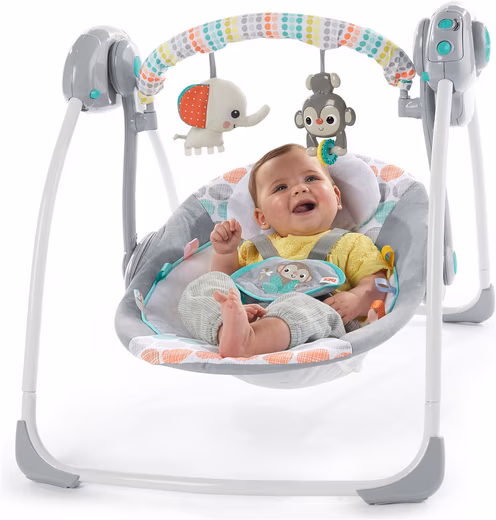 Swing, rock, and sway your baby to more restful breaks with the Bright Starts Whimsical Wild portable swing. Like a monkey swinging from tree to tree, your baby will go crazy for this comfy seat (in the most relaxing way). You’ll love knowing your baby can rest safely in a place where they’ll have almost as much fun as in your arms. With its 2-position recline, this swing is guaranteed to be cozy. Two smiling toys hang from the easily removable toy bar, so your baby can swing in good company. Ten cheerful melodies make swing time musical time, and an adjustable five-point harness keeps baby secure in their deep cradle. The lightweight and foldable design makes it easy to pack away this mini baby swing, as compact and cozy as it is. But don’t let its small size fool you—this swing is packed with features. Weight-adjustable technology means newborns and toddlers enjoy their favorite speed as they grow. And thanks to WhisperQuiet technology, you’ll only hear your happy baby’s sweet sighs and babble. Requires 4 baby batteries.